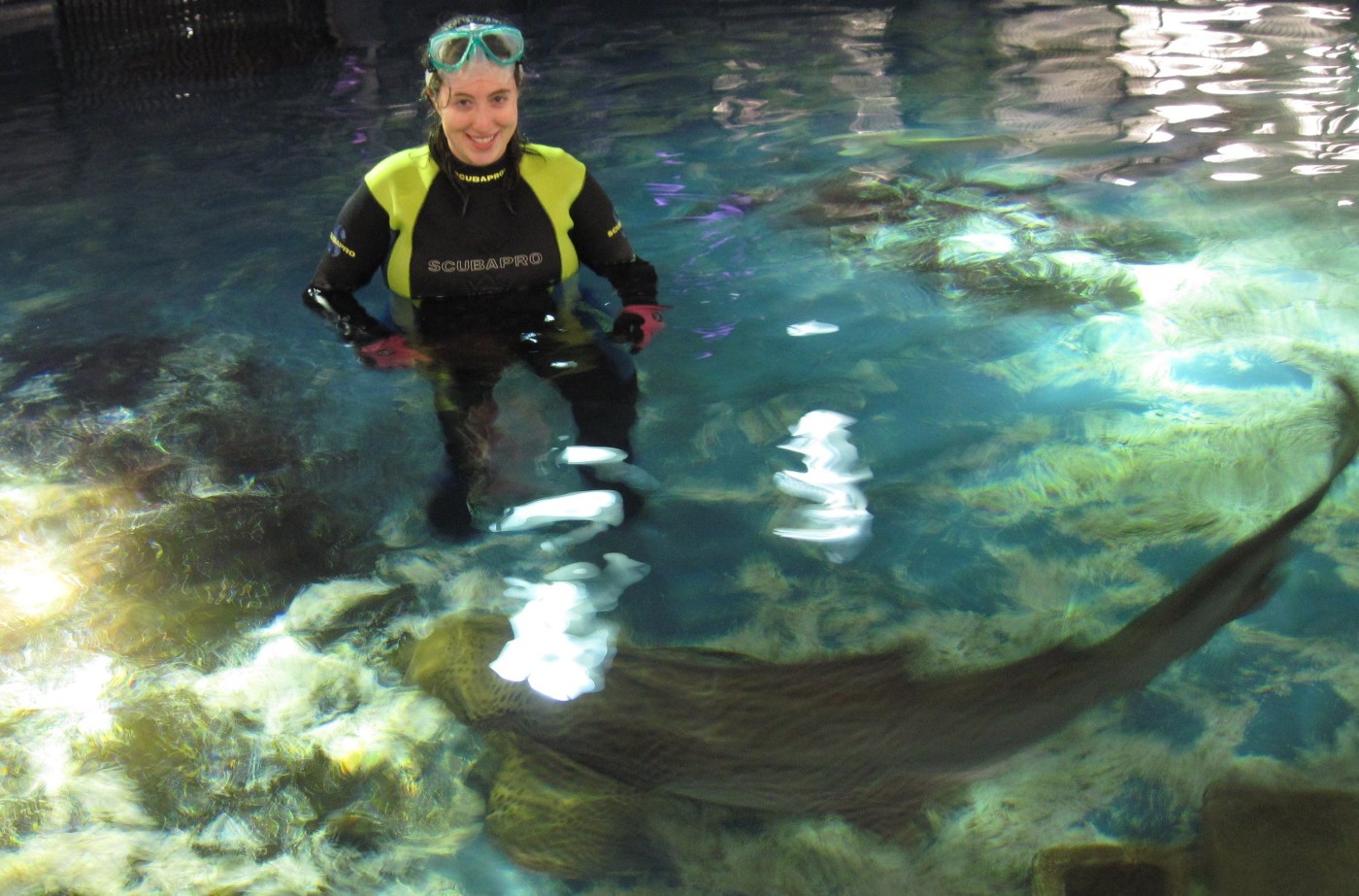 During her time as the director of the marine research facility that became the Mote Marine Laboratory in Florida, Clark made several huge discoveries and advances in shark training and behavior. Most notable was her work in trained behaviors. She was the first person to ever target train sharks. She experimented with operant conditioning of two lemon sharks and three nurse sharks. Through slow and repetitive positive reinforcement, she taught the sharks to associate a target and underwater bell with food. These training methods, now extremely common in aquariums (I personally used her methods daily during my time taking care of sharks in an aquarium, pictured above), was extremely notable at the time. Previous to her work, scientists and the public alike had always thought sharks were dumb, untrainable monsters (Jaws anyone?). Her study shook up many in marine science. No previous studies had ever been conducted on their trainability due to the prejudice against them having any measurable intelligence. She smashed through that myth, and it only took her a few days of training to do so!